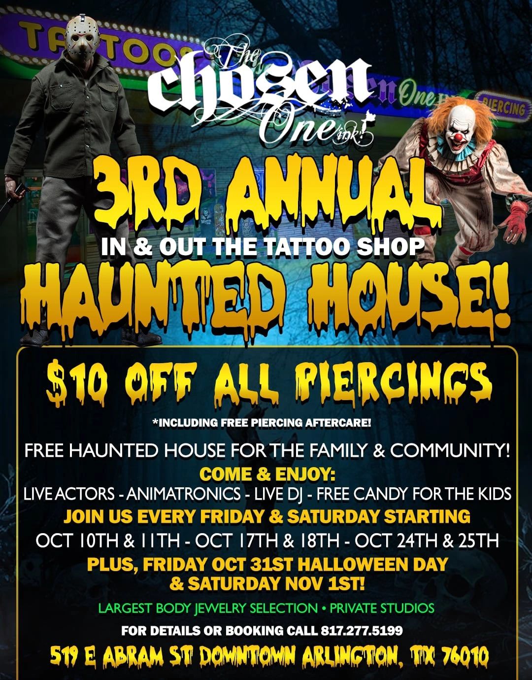 The Chosen One Ink has been serving Tattoos & Piercings to Arlington, Grand Prairie, and Mansfield residents for the past 16 years! We are located in Downtown Arlington, Tx and walking distance from The University of Texas at Arlington! We are minutes away from AT&T Stadium, The Lowes Hotel, Choctaw Stadium, Epic Central, General Motors, Summit Racing, Epic Water Park, The Park's Mall, Texas Live Arena, Six Flags Over Texas and Global Life Field! Let's just say we are deep in The Heart ❤️ of The Metroplex! Here at The Chosen One Ink our goal is to make you feel right at home, and for you to get that tattoo you truly desire! We all know money is huge factor but, we will give you a good price for The Best of Work! Our Tattoo Artist are all "OSHA Bloodborne Pathogen Certified, and we are Certified from The Texas State Health Department LLC . All of our equipment are state of the art and 100% sterile! With years of experience and the awards to prove it! The Chosen One Ink is known to be one of "The Best Tattoo Studios in the Great State of Texas!